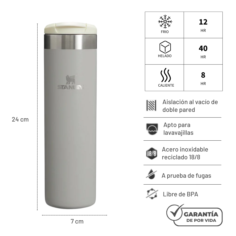 Diseñada para un uso cotidiano, la botella insulada Transit AeroLight es un tercio más liviana que las botellas estándar Stanley de acero inoxidable. El secreto es la tecnología de peso pluma AeroLight™ de Stanley que no compromete la durabilidad ni el rendimiento térmico. La tapa para beber se cierra herméticamente para llevarla en tu bolso o mochila. Mantiene tus líquidos calientes durante 8 horas, fríos durante 12 horas o congelados durante 40 horas.